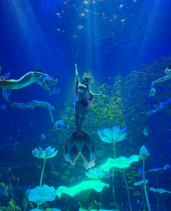 “在绝境中,人鱼们奋力托起纯白的希望,化身天使,振翅拂浪。”在舒缓的音乐声中,三条美人鱼身披流光溢彩的鱼尾出现在舞台中央,她们的头发在水中自由飘散,如同黑色的绸带;她们身姿矫健,时而围成圆圈,头朝内、尾向外,如同海洋中盛开的花朵;时而排成一列,鱼尾在空中画出一个又一个完美的圆环。