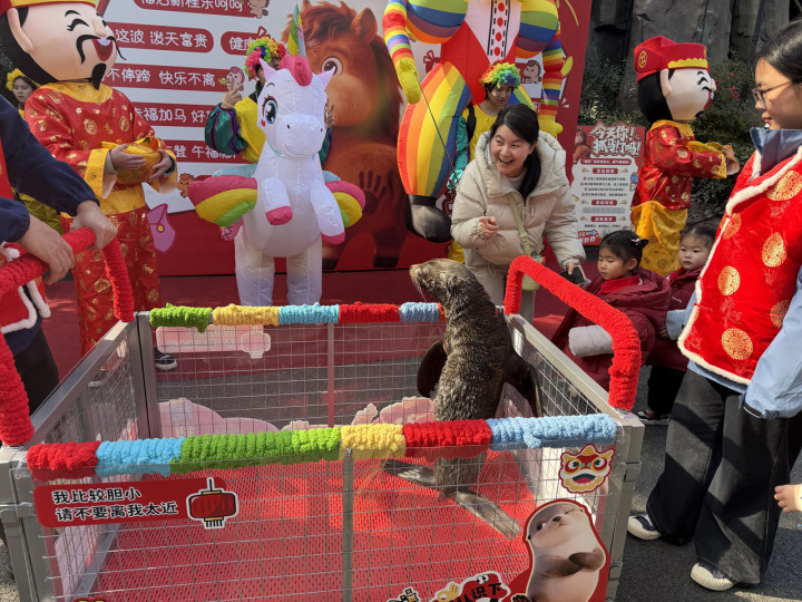 杭州长乔极地海洋公园2008年开园,是杭州人熟悉的老牌亲子乐园。记者发现,今年为了承接春节流量,“老乐园”推出了不少“新玩法”。下午3点海洋抓马嘉年华新春限定大巡游开始了,人群早早地列队欢迎,可可爱爱的海狗“布丁”晃着脑袋开路,驮着金元宝的羊驼“万圣”压阵,海洋人偶一路击掌“比心”,分发小礼物,游客们纷纷伸手去接,欢声笑语洒满了整条巡游路线。